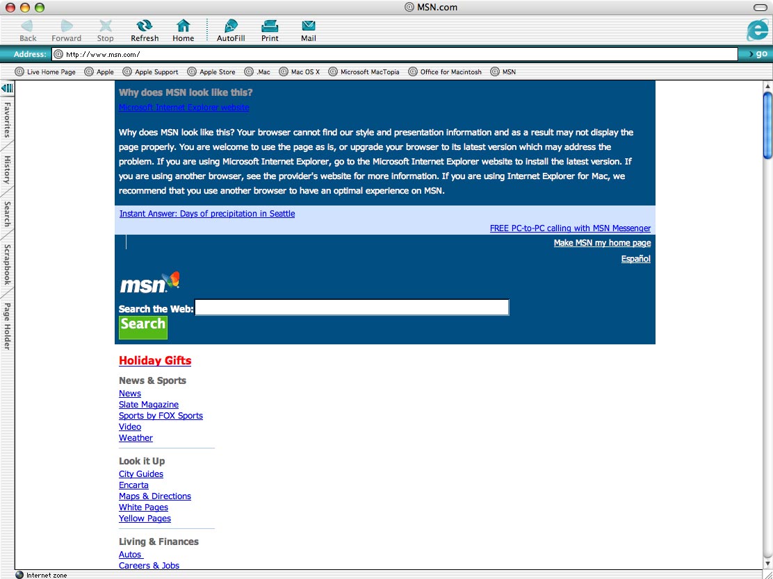 “Your browser cannot find our style and presentation information and as a result may not display the page properly. You are welcome to use the page as is, or upgrade your browser to its latest version which may address the problem. If you are using Microsoft Internet Explorer, go to the Microsoft Internet Explorer website to install the latest version. If you are using another browser, see the provider’s website for more information. If you are using Internet Explorer for Mac, we recommend that you use another browser to have an optimal experience on MSN.”