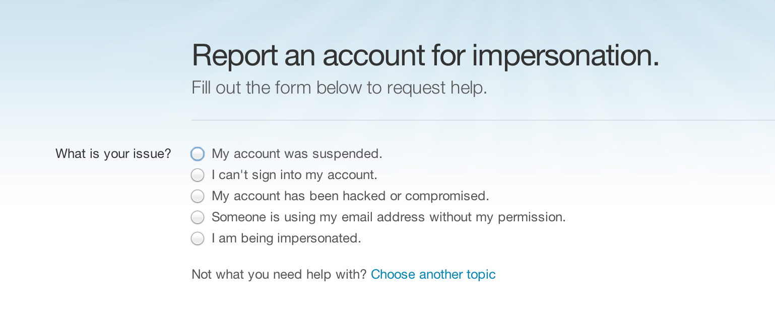 A few days later, I uncovered a new form they had rolled out for a personal brand impersonation request and this was closer to the criteria that my situation fell under. It wasn't the perfect fit for my case, but I gave it a go knowing I had to start somewhere. I submitted the form making a plea that I needed to receive this premium twitter handle for the good of my personal brand.